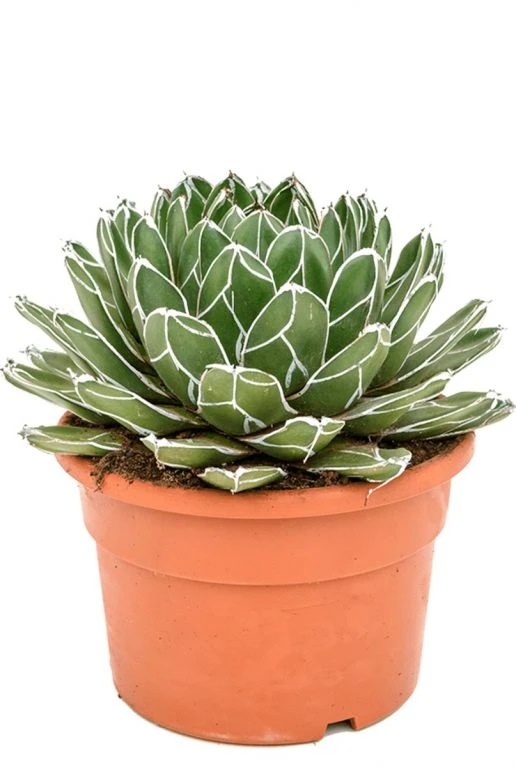 Deze mooie Agave staat bekend om de witte lijntjes die een mooi patroon geven in het blad. De specifieke soort is de Victoria Reginae en zal in onze woonkamer niet veel groter worden. Tip: door deze succelent in een witte pot te zetten komen de witte lijnen nog mooier uit.