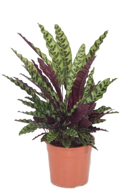 Deze Calathea Lancifolia wordt ook wel pauwenplant genoemd door zijn prachtige kleuren. Hij heeft lange groene bladeren waarbij de onderkant paars kleurig is.