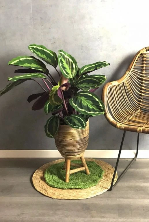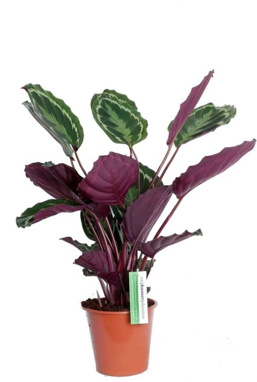 De Calthea Medallion (pauwenplant) heeft zijn naam te danken aan zijn ronde prachtige bladeren. Bij deze kamerplant is de bovenkant van het blad groen met een mooi lichtgroen patroon. De onderkant van de bladeren zijn paars rood van kleur, dit maakt deze plant een echte eyecatcher.