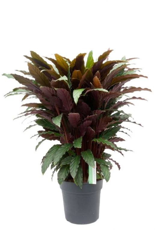 Deze volle Calathea Wavestar kamerplant heeft langwerpige groene bladeren. Het blad heeft een paars rode onderkant die zacht aanvoelt. In de avond sluit deze plant zijn bladeren omhoog en wordt daarom ook wel de levende plant genoemd.