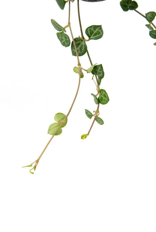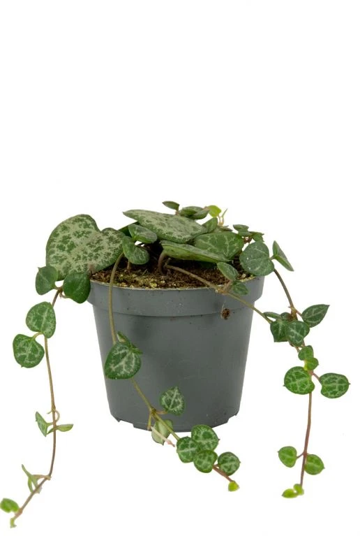Deze stek van Ceropegia woodii, of Chinese lantaarnplant, is bekend om zijn hartvormige bladeren. De plant behoort tot de vetplanten, wat betekent dat de Ceropegia veel water in haar bladeren opslaat. Dit maakt de plant gemakkelijk te verzorgen en snelgroeiend.