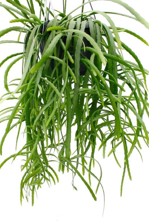 Lepismium bolivianum is een hangende plant met lange, dunne groene slierten. Deze plant is oorspronkelijk een epifyt, wat betekent dat hij op boomtakken groeit. Hij lijkt ook erg op een cactus, omdat hij voedsel en water opslaat. Geef hem een zonnig plekje en hij zal schitteren in je huis.
