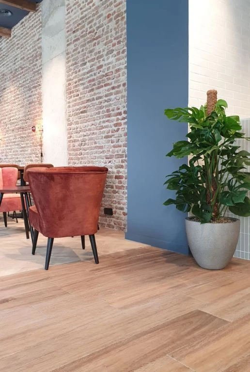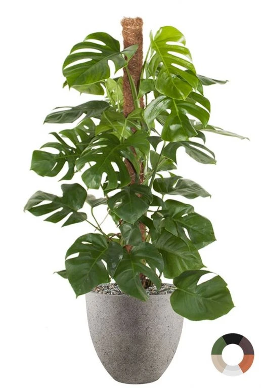 Deze mooie kamerplant die langs een mosstok groeit heeft de naam Philodendron Monstera. Hij staat geweldig in deze betonlook plantenbak die verkrijgbaar is in drie kleuren. Hij wordt kant en klaar bij je geleverd door ons eigen transport.Â