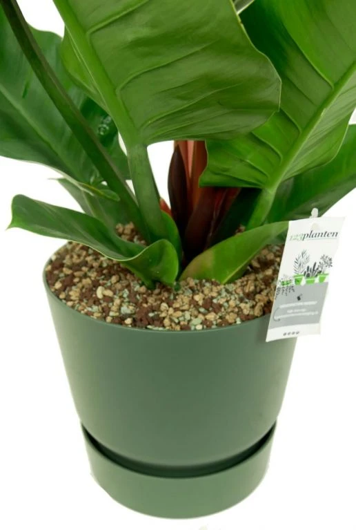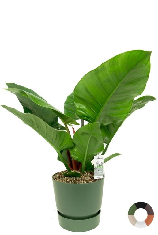 Deze prachtige groene kamerplant heeft enorme bladeren en heeft de naam Philodendron Imperial Green. Hij is gecombineerd met deze mooie Elho Greenville pot en wordt kant en klaar geleverd. Welke kleur pot kies jij?