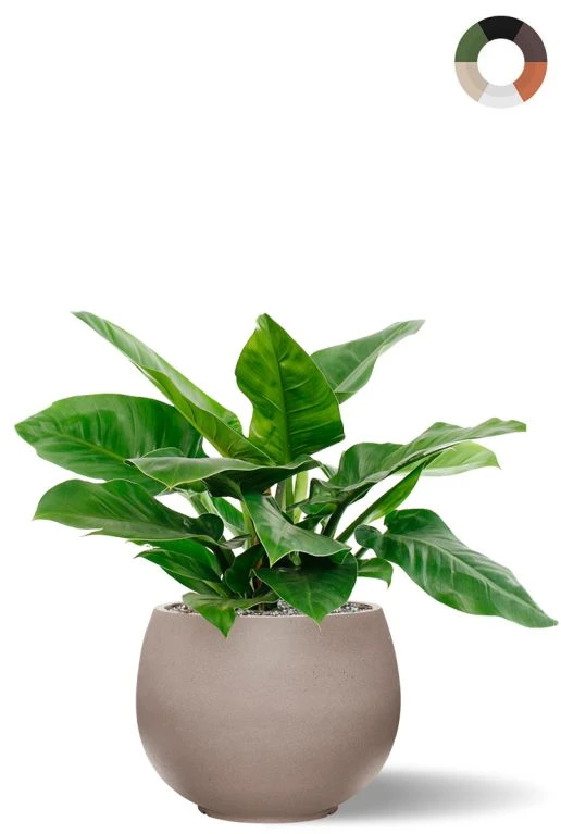 Deze mooie ronde bloempot is te bestellen in twee kleuren. De pot is licht van gewicht maar heeft het uiterlijk van een cement pot. De Philodendron Imperial Green heeft grote groene bladeren en staat het liefste op een half schaduw plekje in het interieur.Â