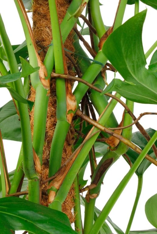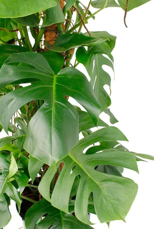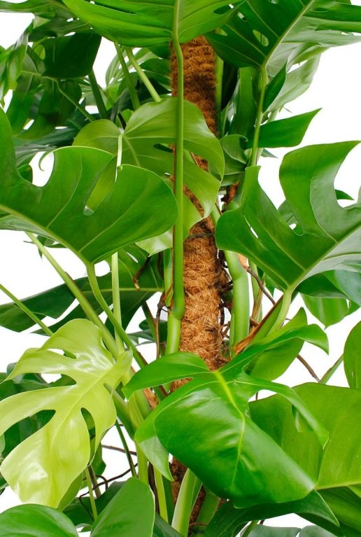 Hele grote Philodendron Monstera kamerplant op mosstok. De mosstok is 200cm hoog en deze klimplant klimt hieraan omhoog. De gatenplant staat bekend om zijn grote groene bladeren met daarin (gaten). Laat deze plant gemakkelijk thuisbezorgen. Â
