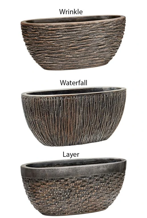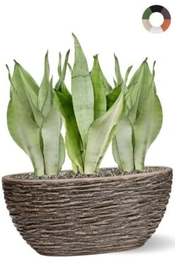Deze prachtige ovale bloempot is brons van kleur en heeft een luxe uitstraling. De pot is te bestellen in drie verschillende varianten. Hij is gecombineerd met groene Sansevieria kamerplanten, die gemakkelijk zijn in onderhoud.