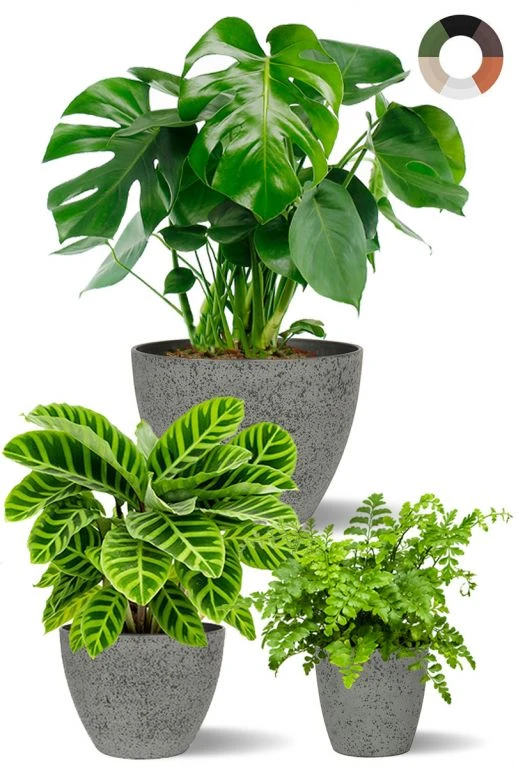 Deze grote planten mix bestaat uit 3 schaduwplanten. De Monstera, Calathea en de Asplenium. Een grote plant voor op de grond en twee kleinere planten voor op de tafel of vensterbank. Zo ben je in een keer klaar en geef je jouw interieur een groen sfeertje. De potten zijn leverbaar in twee verschillende mooie kleuren en zijn volledig waterdicht.Â