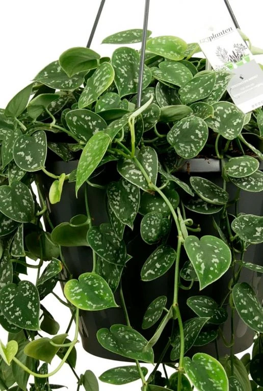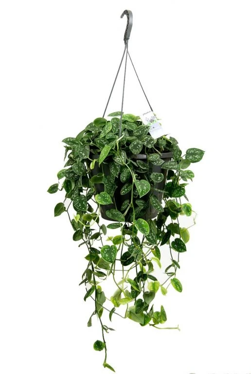 Deze grote hangplant is een Pictus Argyraeus. Hij heeft donker groene bladeren met kleine witte accenten in het blad. plaats deze kamerplant op een plekje met halfschaduw.